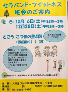 投稿日: 2025年11月30日 投稿者: mitsuセラバンド・フィットネス班会のお知らせ ・2025年12月6日(土)、12月20日(土)いずれも午後2時から3時 ・こつまの里4階(西成区松2-1-35) セラバンド・フィットネス班会のおしらせ