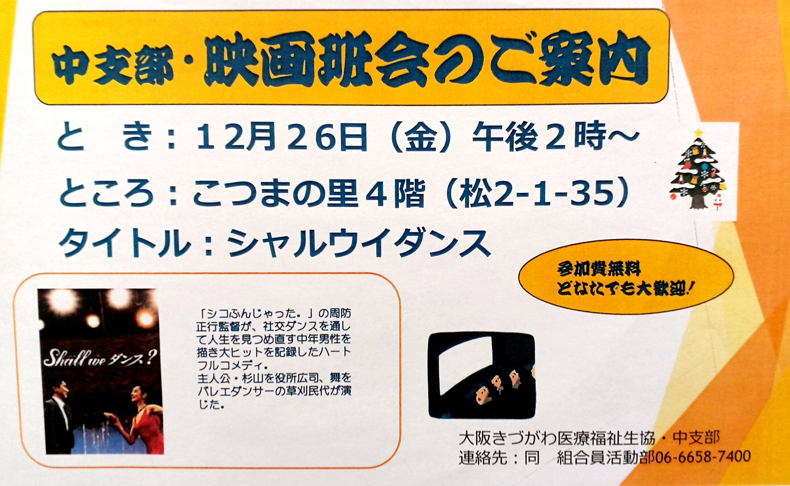 投稿日: 2025年12月12日2025年12月12日 投稿者: mitsu中支部12月映画班会 中支部映画班会 ・12月26日(金)午後2時から ・こつまの里4階(西成区松2-1-35) ・タイトル「シャル・ウィ・ダンス」 ・参加費:無料、どなたでも大歓迎!