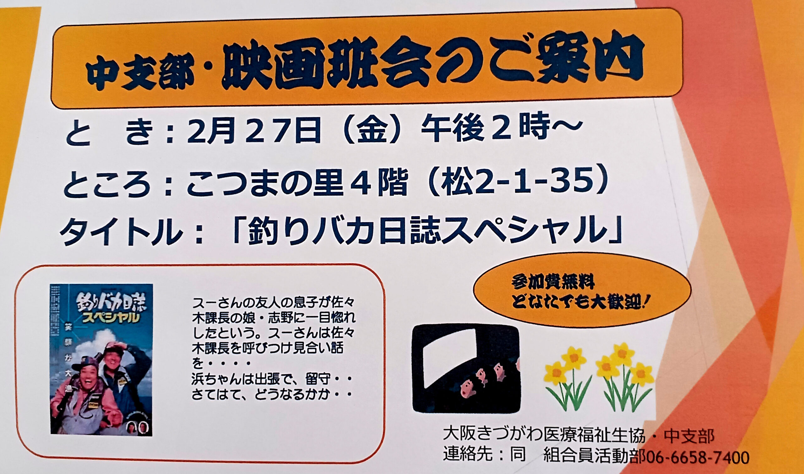 投稿日: 2026年2月14日 投稿者: mitsu中支部・映画班会のご案内 とき:2026年2月27日(金)午後2時から ところ:こつまの里4階(西成区松2-1-35) タイトル:釣りバカ日誌スペシャル 参加費無料、どなたでもお気軽にどうぞ! 中支部映画班会