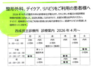 投稿日: 2026年3月25日 投稿者: mitsu2026年4月から整形外科の診療単位が増えます! 整形外科、リハビリ、デイケアをご利用の皆さまへ、より充実した診療単位へ増加します。ご利用をお待ちしています。詳細は、画像をごらんください。 2026年4月からの整形外科など診療単位表