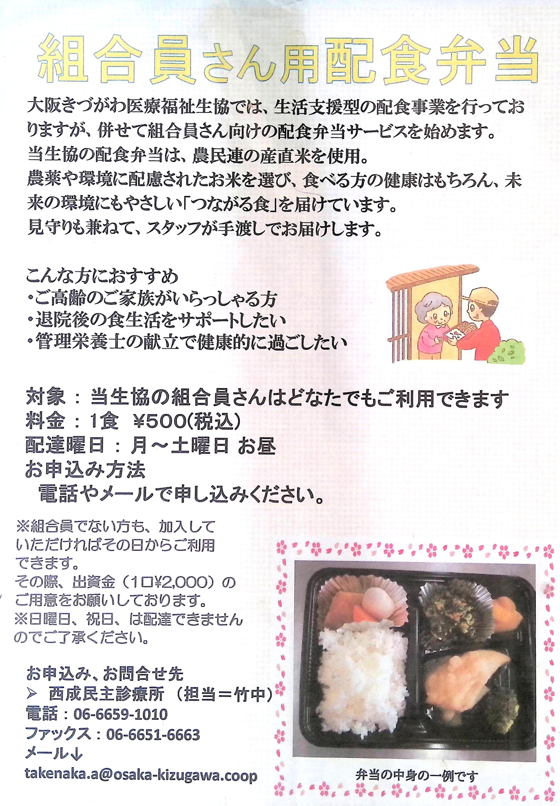 大阪きづがわ医療福祉生協では、生活支援型の配食事業を行っておりますが、併せて組合員さん向けの配食弁当サービスを始めます。